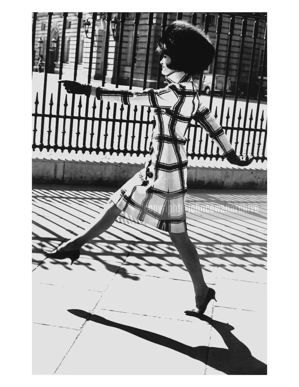 ‘Stealing a March on the Guards’ Buckingham Palace, London. Model Marie-France, fashion study for The Observer, published September 10, 1961. Coat and ‘bearskin’ hat by Mary Quant.